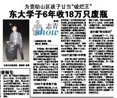 宋玉静是2009级公共事业管理专业的一名学生,她告诉记者,这个项目最初由学长发起,社员们都十分积极地支持着这个活动,“每次收集瓶子都有二三十人参加。失学儿童是‘折翼的天使’,我们希望用自己的爱心来帮助他们。”