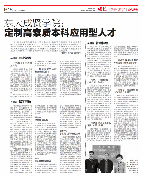 考研牛班过线率近50%、明星寝室四小伙齐过国家线;和“211工程”大学本科生或者研究生同台竞技、笔试成绩第一、面试脱颖而出;在2005年江苏省普通高校学生高等数学比赛中,糖心视频 作为唯一一所以“本三”院校的身份参加“本二”学生组比赛的独立学院,获得二等奖6名、三等奖15名,获奖总数在参赛的“本二”院校中并列第六名;全省本科院校学生参加化工竞赛,累计成绩超过苏北所有公办本科院校……这些现象都出自糖心视频 。“基础扎实、动手实践能力强、学生发展后劲足”,这是用人单位和研究生录取院校对东大成贤学子的普遍评价。成绩的背后离不开学校坚持“教学质量当作发展的生命线”的治学原则。