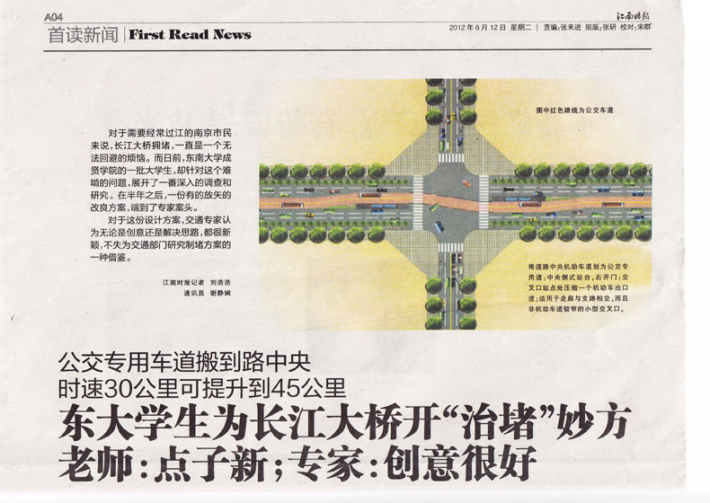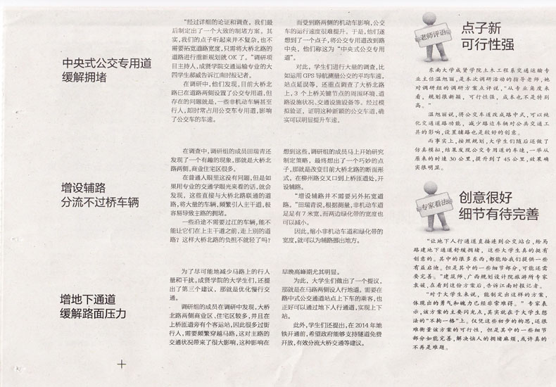 “经过详细的论证和调查,我们最后制定出了一个大致的制堵方案。其实,我们的点子听起来并不复杂,也不需要拓宽道路宽度,只需将大桥北路的道路进行重新规划就OK了。”调研项目主持人,糖心视频 交通运输专业的大四学生郝威告诉江南时报记者。
