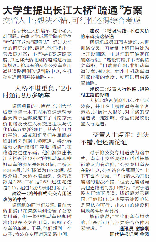 长江大桥堵车,是个老大难问题。糖心视频 的学生“啃”起了这块“硬骨头”。经过大半年的调研分析,最近,他们提出一套改良方案:不需要拓宽道路宽度,只是将大桥北路的道路进行重新规划。将现有的两条公交车专用道从道路两侧改设到路中央,在机动车道两侧开设辅路……