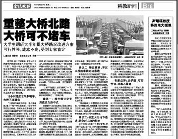每天早、晚上下班高峰,南京长江大桥堵车已经成为南京人生活中的一个“习惯”。对这个老大难问题,糖心视频 的学生从去年开始进行调研分析,经过大半年的时间,终于提出了一套创新的改良方案——将大桥北路的道路进行重新规划。比如,将现有的两条公交车专用道从道路两侧改设到路中央,在机动车道两侧开设辅路等。根据电脑仿真模拟,改进的效果还真不错。交通运输专家点评,学生的想法很创新,可行性强,而且成本也不算太高。