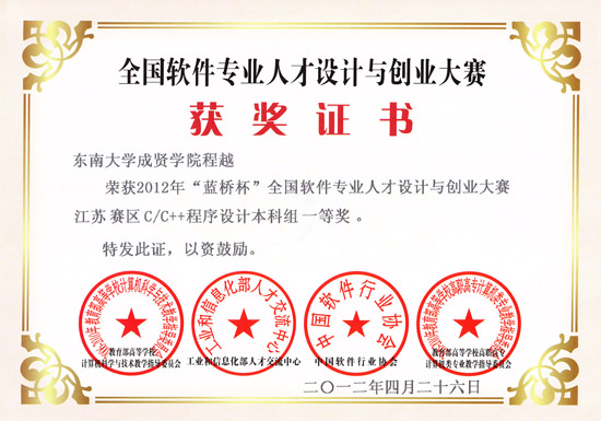 2012全国蓝桥杯软件人才设计大赛获得一等奖的程越同学