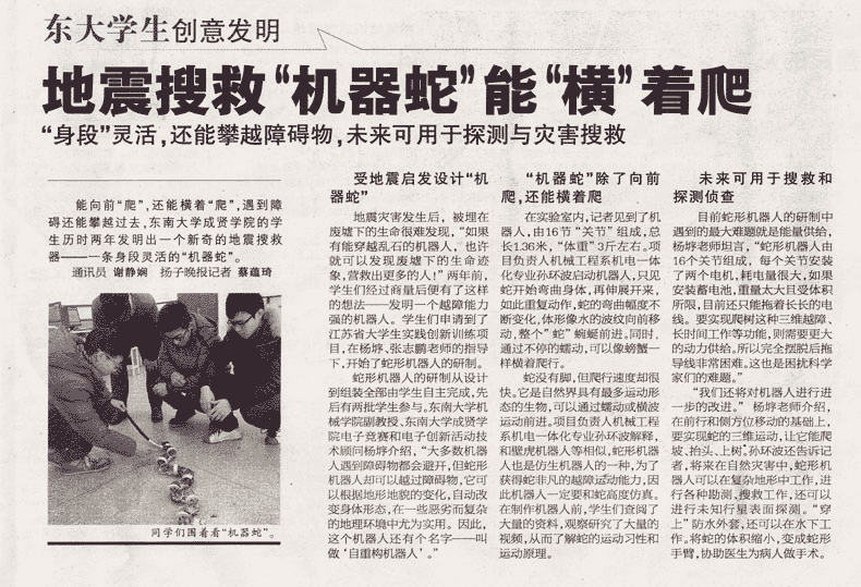 【扬子晚报】地震搜救“机器蛇”能“横”着爬