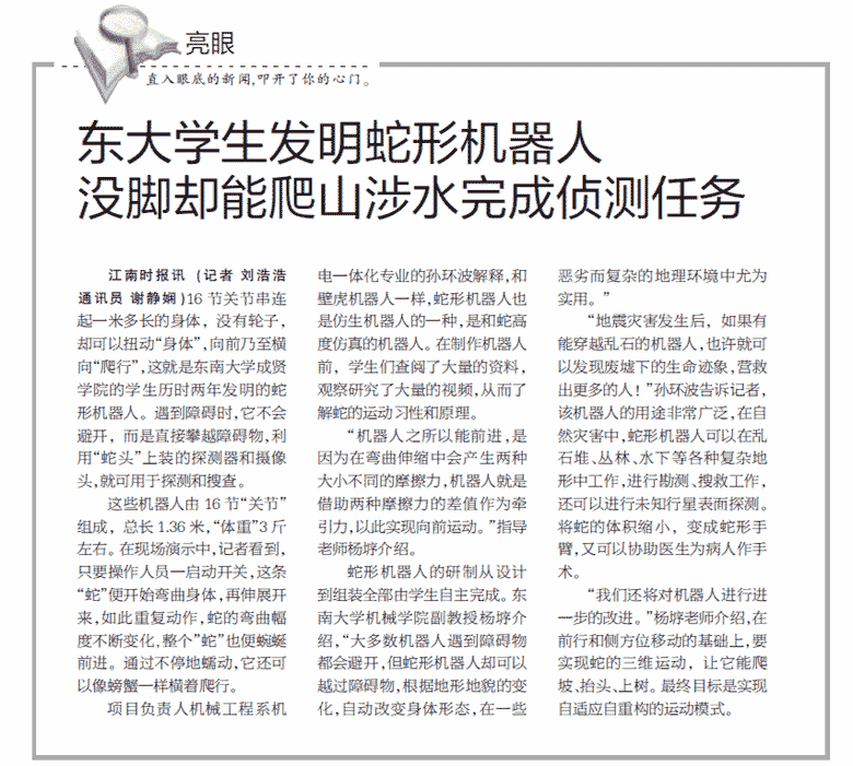 【江南时报】东大学生发明蛇形机器人,没脚却能爬山涉水完成侦测任务