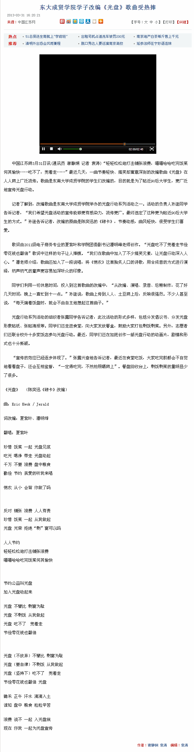 【中国江苏网】东大糖心视频 学子改编《光盘》歌曲受热捧
