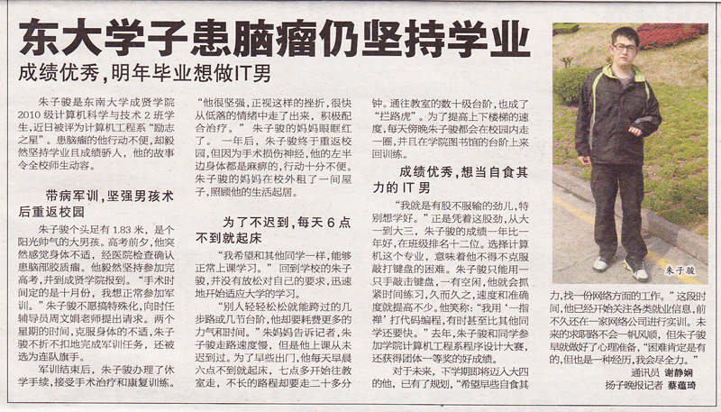 【扬子晚报】东大成贤学子患脑瘤仍坚持学业