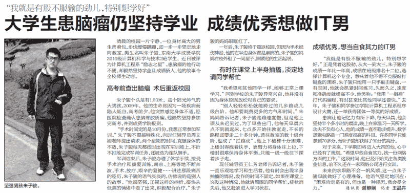【南京晨报】大学生患脑瘤仍坚持学业 成绩优秀想做IT男
