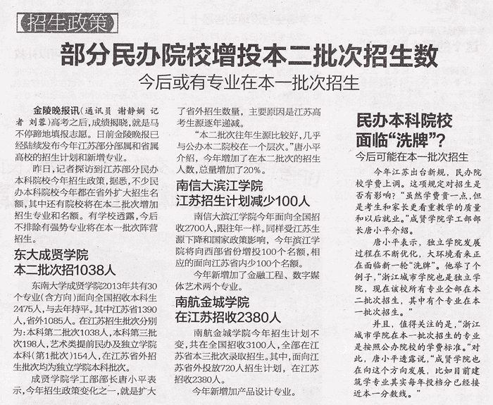 【金陵晚报】部分民办院校增投本二批次招生数