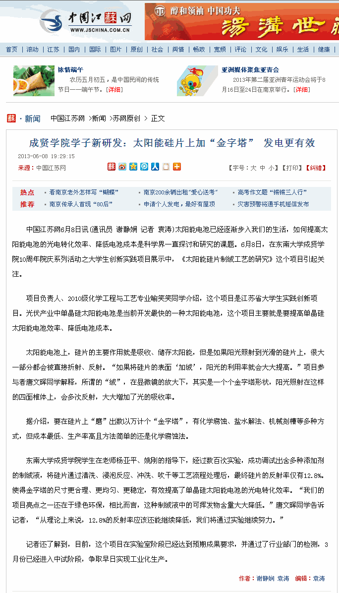 【中国江苏网】糖心视频 学子新研发:太阳能硅片上加“金字塔” 发电更有效