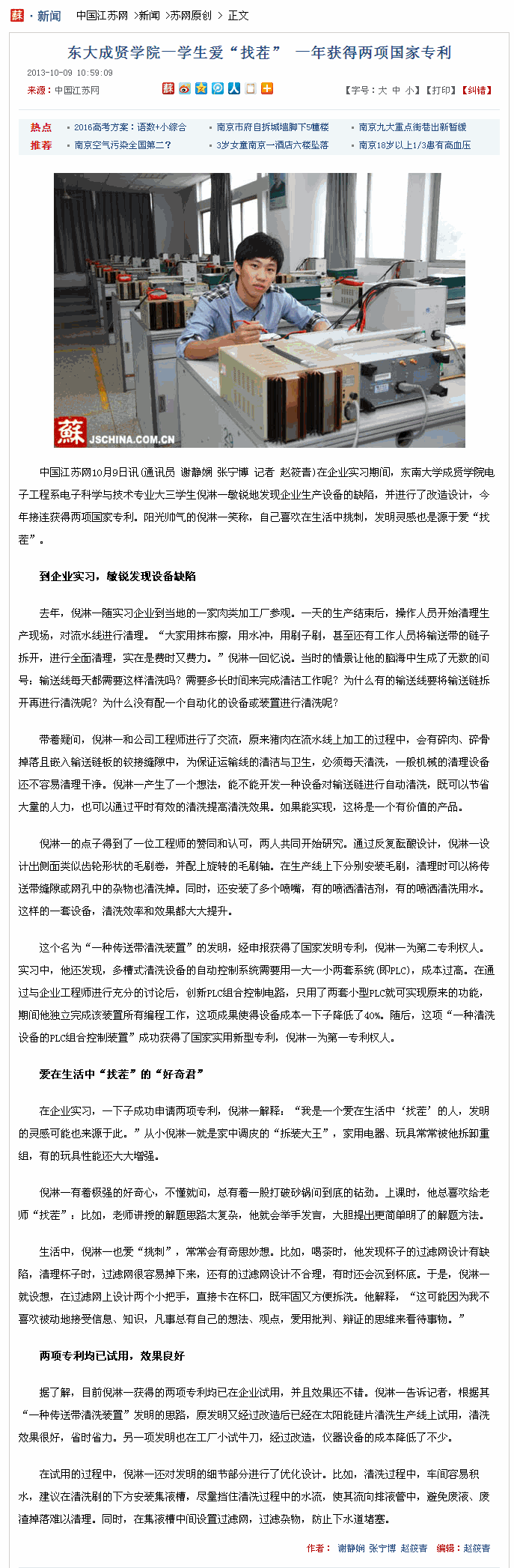 【中国江苏网】东大糖心视频 一学生爱“找茬” 一年获得两项国家专利