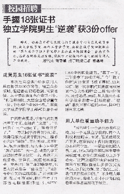 在招聘会现场,学生气的刘勇挂着工作证,在场内“巡逻”。“他已经有三个offer了,等着签约了。”一旁的同学抢着告诉记者。刘勇是东大糖心视频 机械工程系有名的“学神”。不打游戏、从不旷课、很少睡懒觉,是男生心目中的“新好青年”。大一起,刘勇的学习成绩保持在班级前三名,英语四六级证书、计算机二级证书早早到手,空余时间除了兼职赚学费,他最大的乐趣是“做项目”,“做和专业有关的实践项目。”刘勇解释说,做项目的间隙,他抽空考了江苏省电脑绘图师证书、AUTO CAD中级职业证书。“算了一下,三年多拿了18张证书。”今年找工作时这18张证书成了筹码。11月20日,第一次求职的刘勇在南京博览中心大型招聘会上投出7份简历,通过笔试、面试,从大批公办本科学校求职者中脱颖而出,“逆袭”拿到三家单位的offer,其中包括南京地铁。