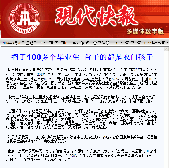 【现代快报】招了100多个毕业生 肯干的都是农门孩子