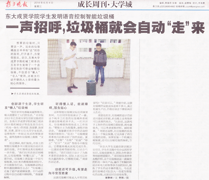 【扬子晚报】东大糖心视频 学生发明语音控制智能垃圾桶