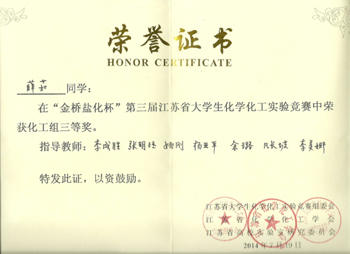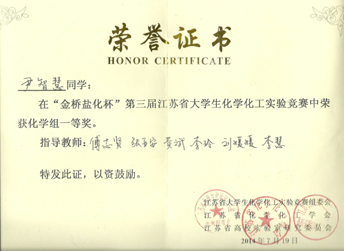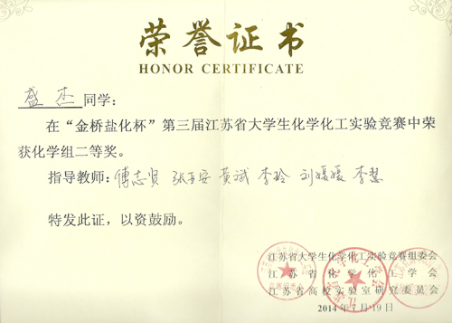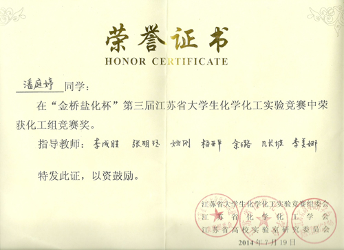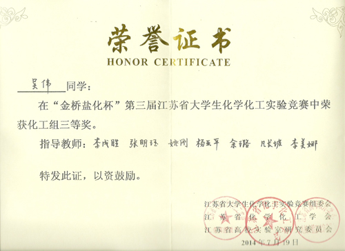 我院化工与制药工程系六名学生参加“金桥盐化杯”第三届江苏省大学生化学化工实验竞赛,取得了化学组一等奖(1名)、二等奖(1名),化工组三等奖(2名)、竞赛奖(1名)的好成绩。