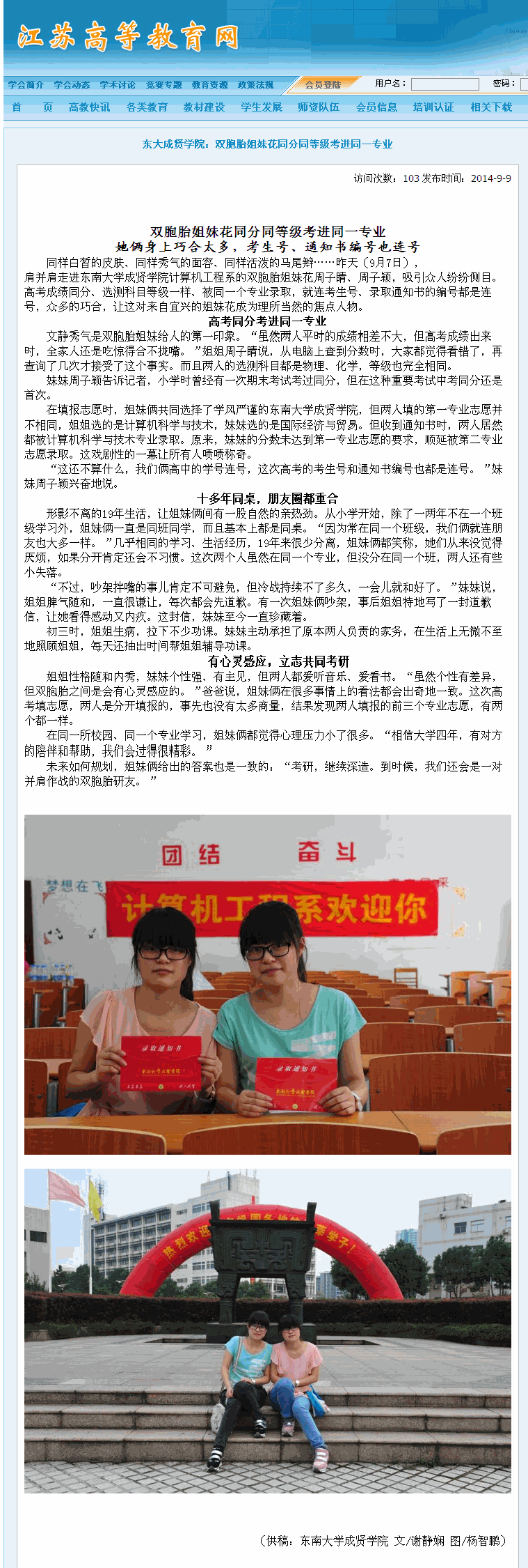 【江苏高等教育网】东大糖心视频 :双胞胎姐妹花同分同等级考进同一专业