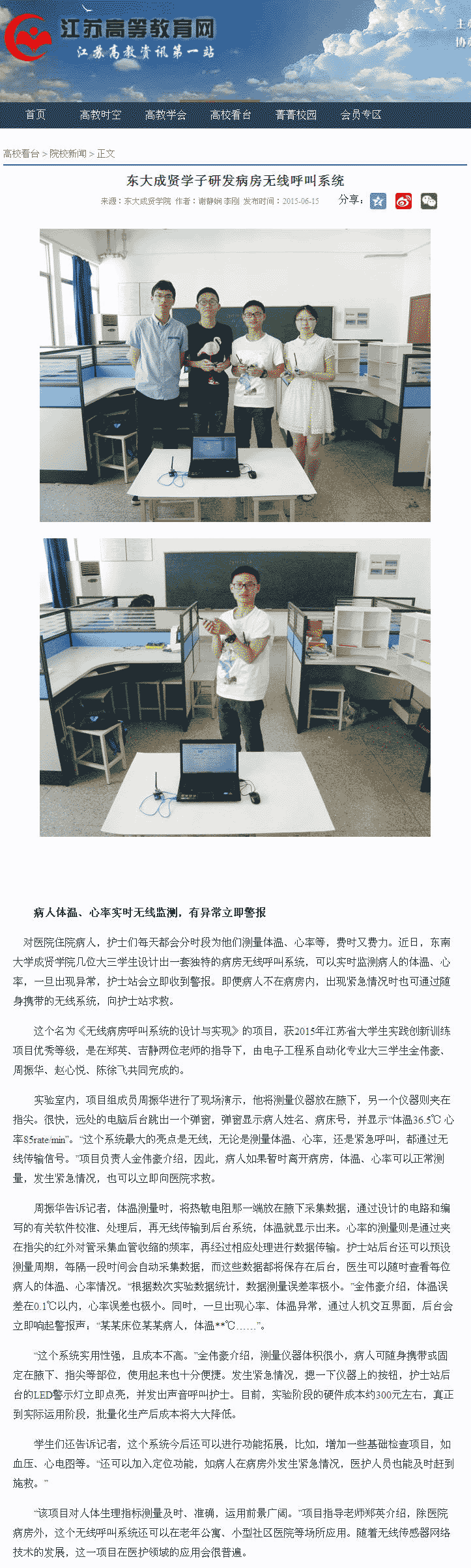 【江苏高等教育网】东大成贤学子研发病房无线呼叫系统