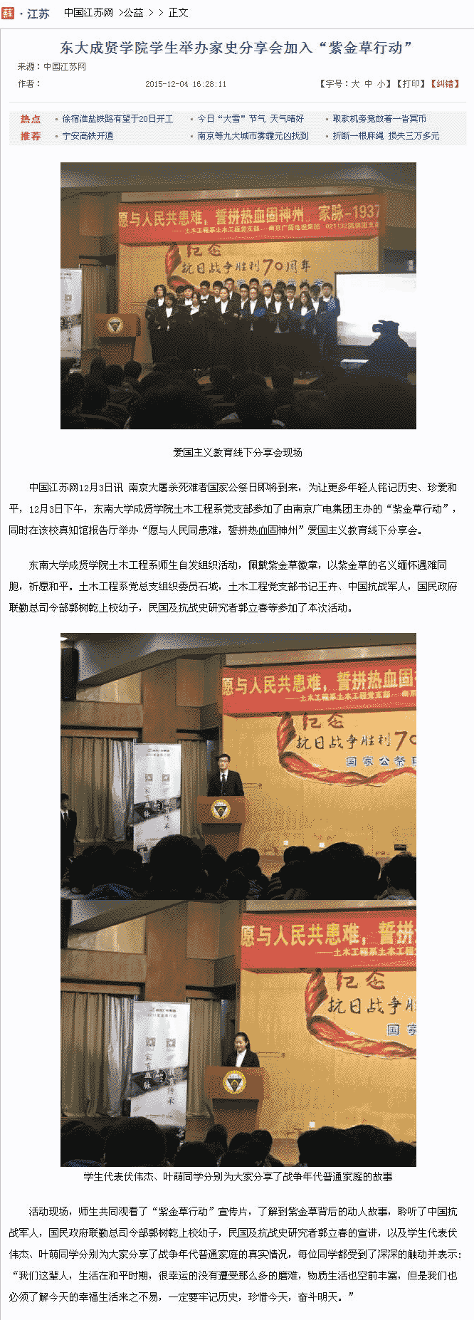 【中国江苏网】东大糖心视频 学生举办家史分享会加入“紫金草行动”