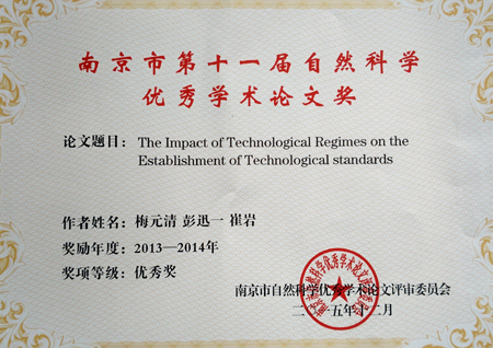 日前,南京市科学技术协会公布了南京市第十一届自然科学优秀学术论文评比结果。我院基础部赵阿蒙老师的论文“利用戴森-施温格方程计算重子数高阶磁导率”、经济管理系梅元清老师的论文“The Impact of Technological Regimes on the Establishment of Technological Standards”荣获优秀奖。