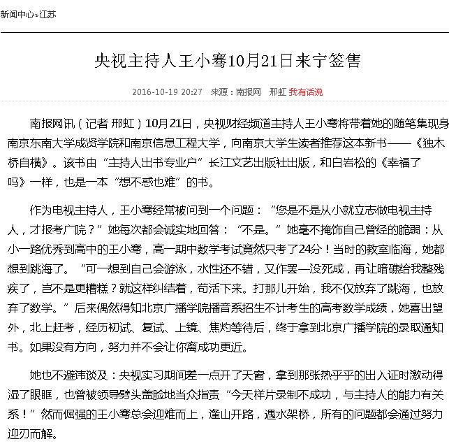 【南报网】央视主持人王小骞10月21日来宁签售