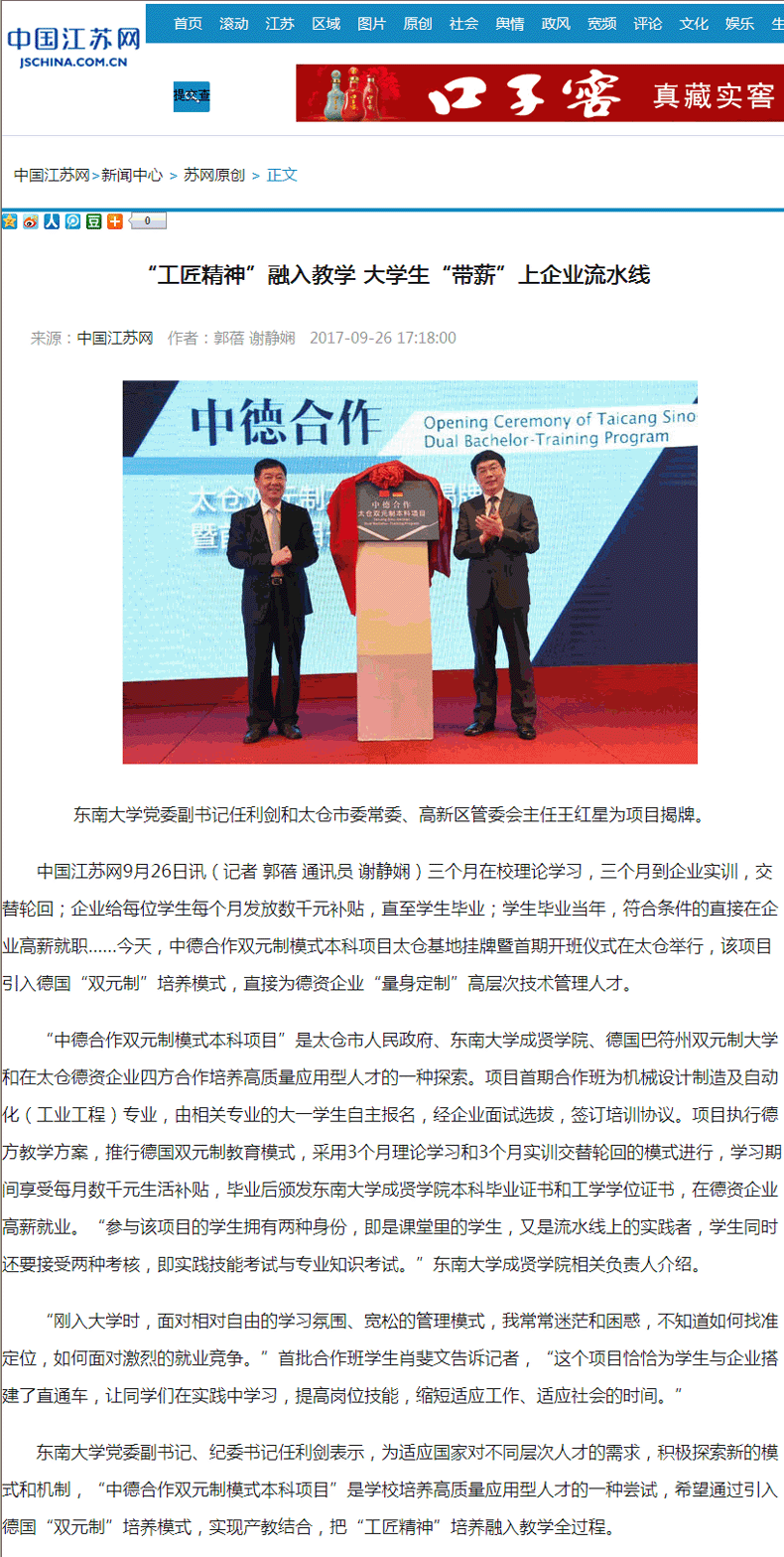 【中国江苏网】“工匠精神”融入教学 大学生“带薪”上企业流水线