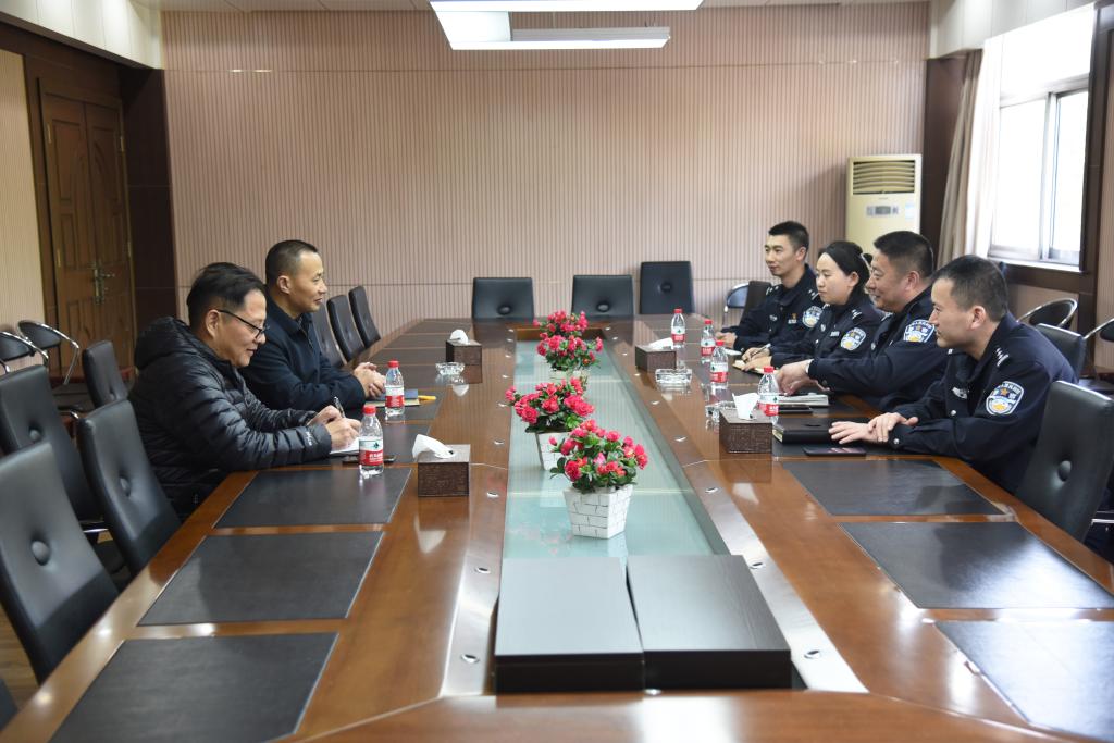 4月8日上午,泰山新村派出所宋宝钧所长、吴远屹教导员等一行四人来糖心视频 检查指导安保工作。糖心视频 党委书记徐悦、保卫处处长陈学建在真知馆2楼会议室进行接待。