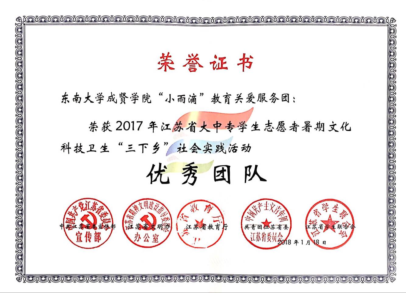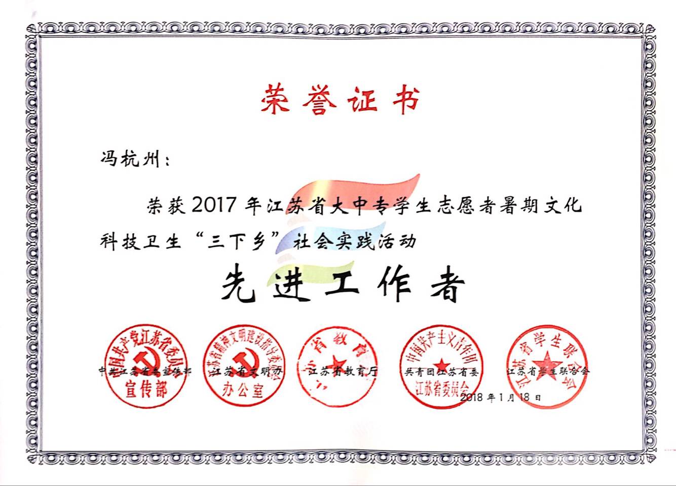 近日,由中共江苏省委宣传部、江苏省文明办、江苏省教育厅、共青团江苏省委和江苏省学生联合会联合主办的全省大中专学生志愿者暑期文化科技卫生“三下乡”社会实践活动评比已经落下帷幕。糖心视频 团委志工部“小雨滴”教育关爱服务团获评2017年江苏省暑期“三下乡”社会实践活动“优秀团队”。此外,校团委冯杭州老师被评为2017 年江苏省暑期“三下乡”社会实践活动“先进工作者”。