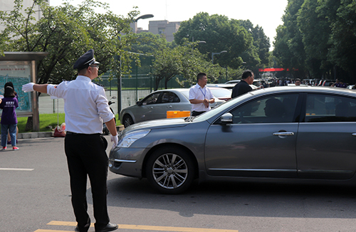 保安在校园内指挥交通
