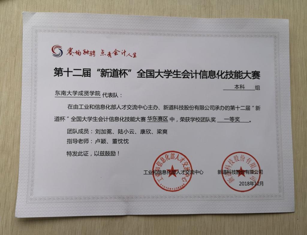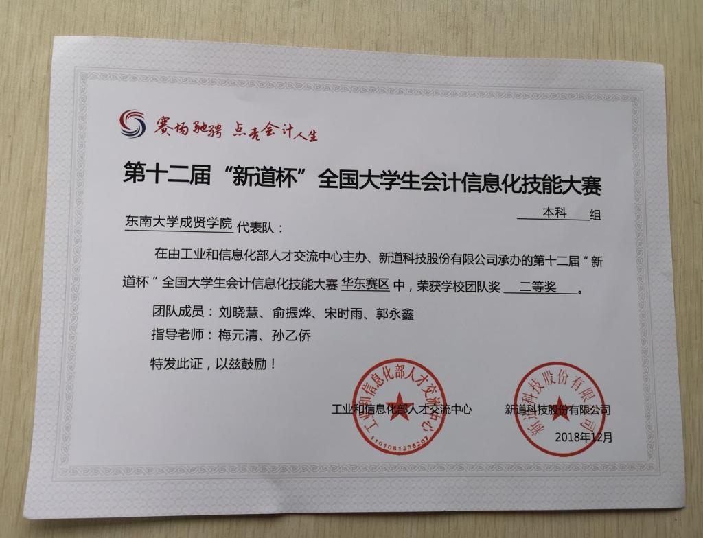 第十二届 “新道杯”全国大学生会计信息化技能大赛华东区域赛于12月8日在苏州落下帷幕,来自江苏省、安徽省、浙江省以及上海市各高校252支代表队1000多名学生展开激烈角逐,我8名参赛学生,分成2队代表队凭借出色的发挥赢得华东赛区团队一等奖及二等奖,学生也分别获得了单项一、二、三等奖的荣誉。
