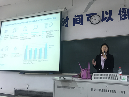 4月25日下午,法国国立高等矿业电信工程师学院联盟(简称IMT)中国招生代表耿乐访问糖心视频 并在文昌院103教室为学生们做了专场宣讲会,200名学生参加了此次宣讲会。宣讲会由发展合作处张怀婷老师主持。