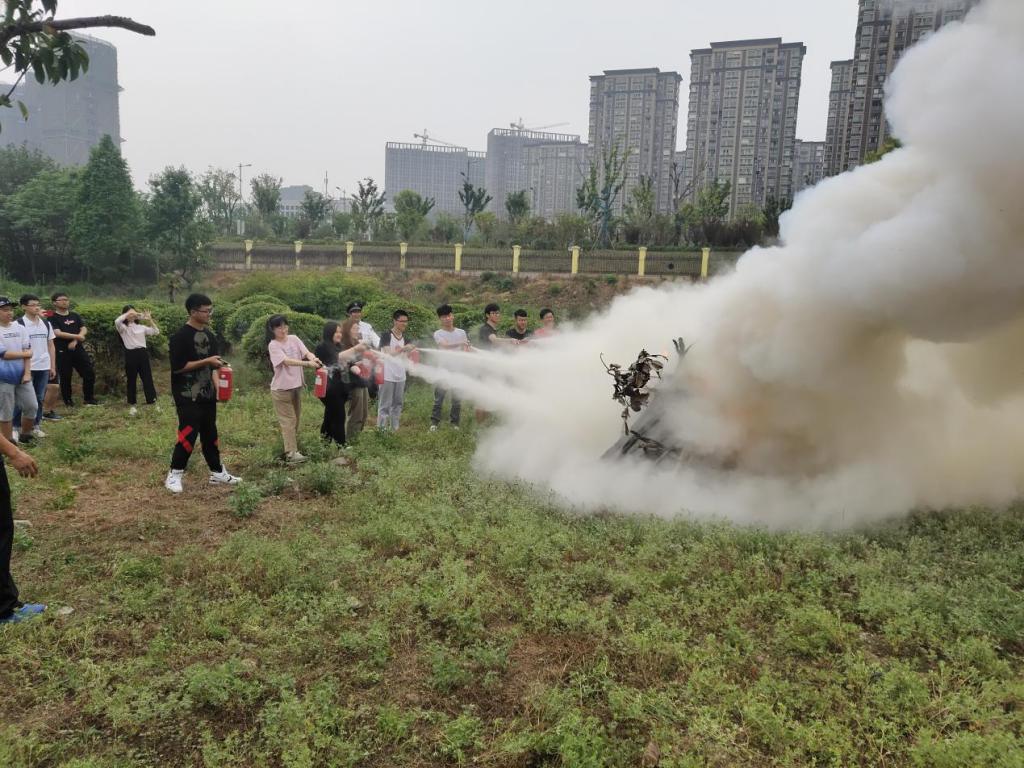 演练开始前,保卫处张河坡老师结合自身专业知识和亲身经历,用幽默风趣的方式讲解了在火灾中自我救护的方法、火灾发生初期的有效扑救方法,并示范了干粉灭火器的正确使用方法。讲解结束后,按照演练预案,参演人员进行实际火源灭火操作。通过真实操作体验,全体参与人员对干粉灭火器的使用、火灾初期的扑救等方面都有了深刻的认识。