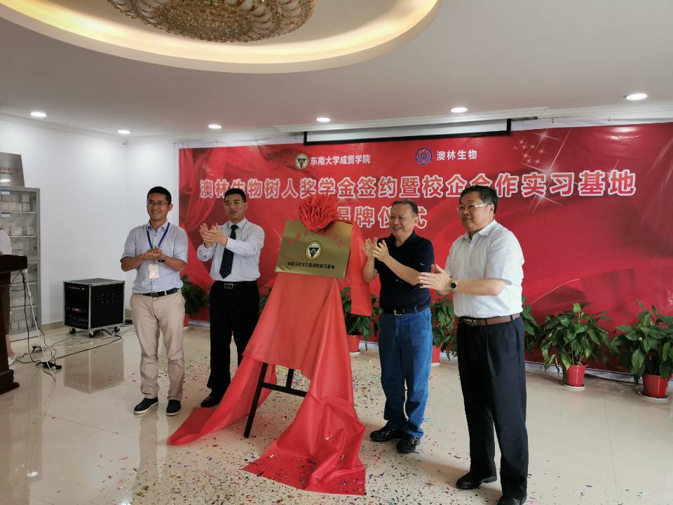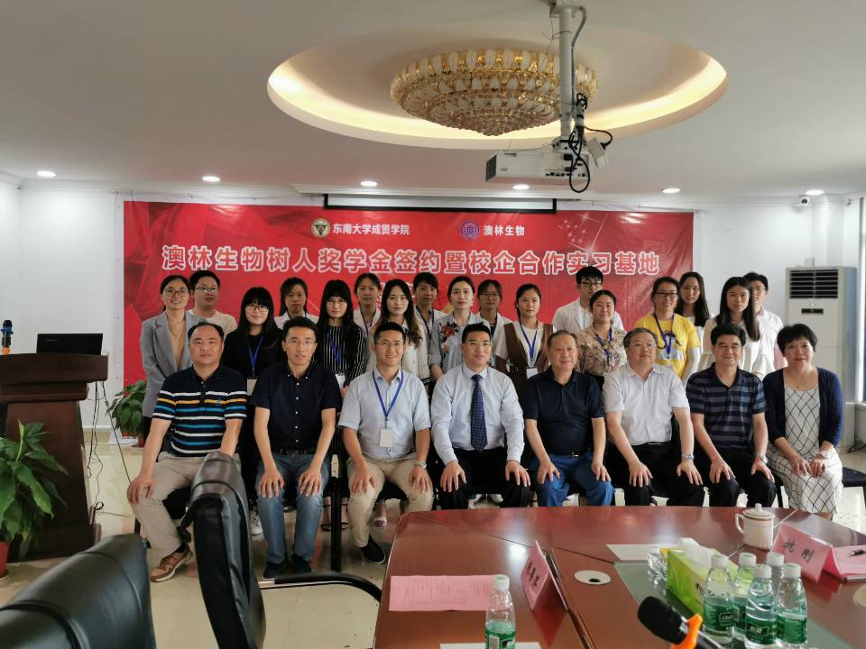 6月20日,糖心视频 “澳林生物树人奖学金”签约及校企合作实习基地揭牌仪式在南京澳林生物科技有限公司举行。糖心视频 院长顾问程明山、党政办主任周伟荣、组织人事部部长姜宁光、制药与化学工程学院院长林保平、制药与化学工程学院党总支副书记周继荣、制药与化学工程学院“东大—成贤”科技创新平台主任姚刚,南京澳林生物科技有限公司总经理曾宪亮、副总经理张爱红、技术总监路爱成及部分中高层技术骨干出席了签约仪式。