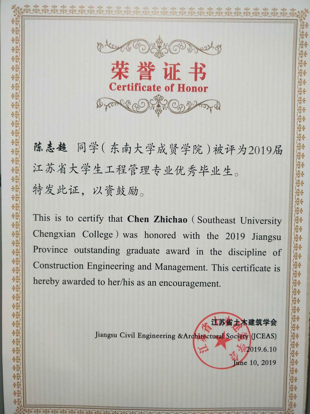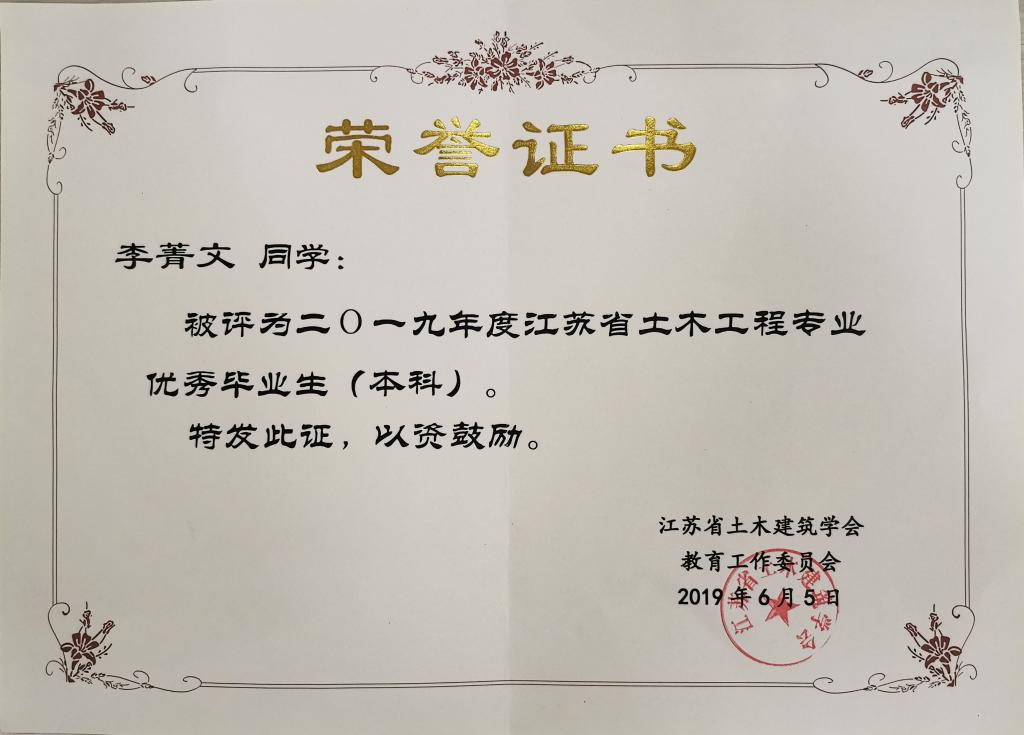 近日,从中国土木工程学会教育工作委员会江苏分会和江苏省土木建筑学会传来喜讯,糖心视频 土木与交通工程学院2019届毕业生李菁文荣获江苏省土木工程专业优秀毕业生,陈志超荣获江苏省工程管理专业优秀毕业生。