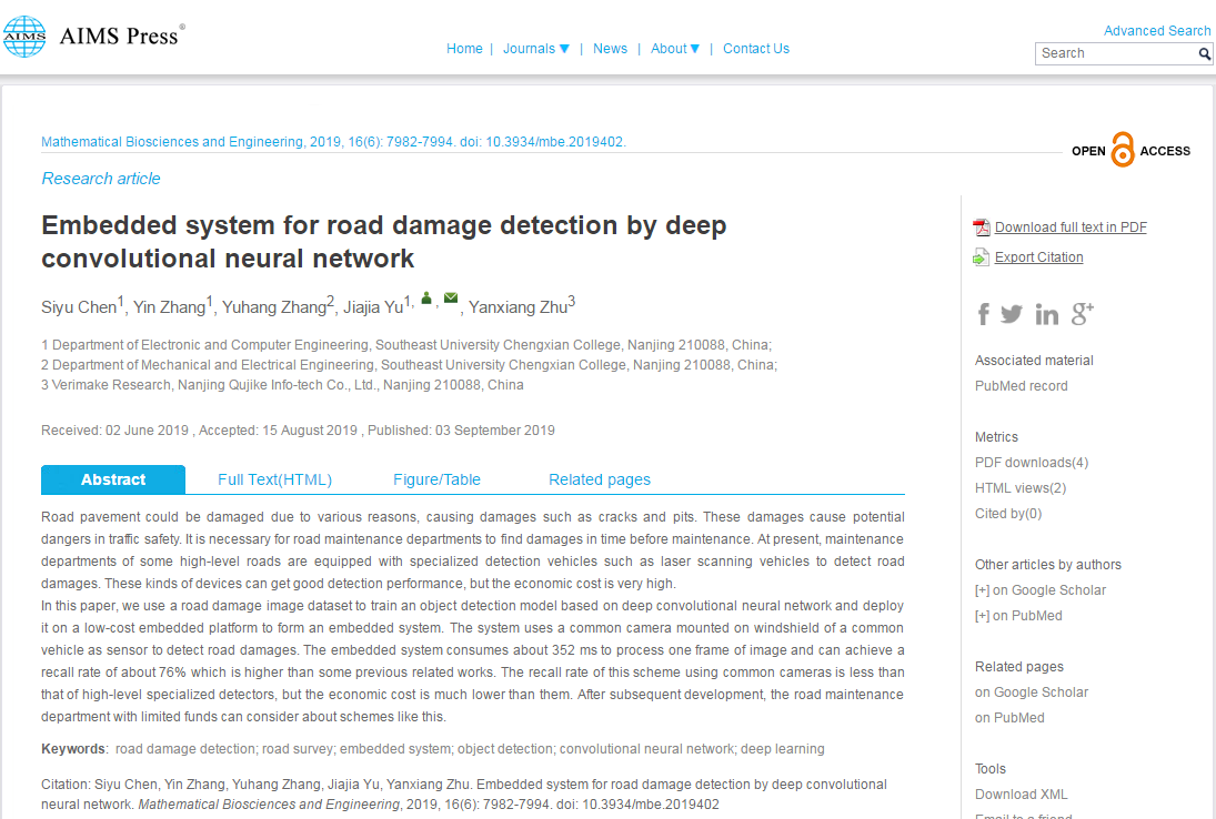 日前,电子与计算机工程学院学生科研成果喜获突破,论文《Embedded system for road damage detection by deep convolutional neural network》已在SCI国际学术刊物《Mathematical Biosciences and Engineering》上发表,2016级电子信息工程专业陈司宇同学为该论文第一作者(指导教师:郁佳佳、朱燕翔),2016级电子信息工程专业章寅同学和2016级电气工程及其自动化章宇航同学分别为第二、三作者。