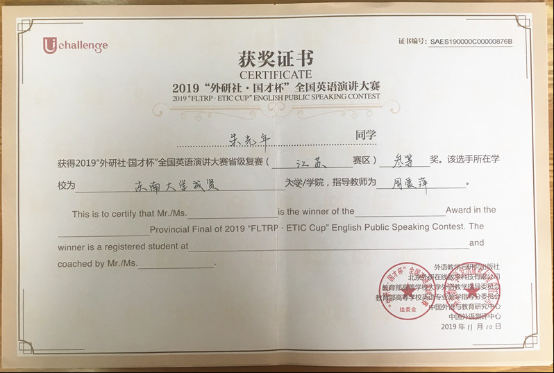 来自约70所本科院校166名学生参加江苏赛区高难度的演讲大赛,2018级计算机4班朱光年(指导老师:周爱萍)获得三等奖,这是糖心视频 在省级该类比赛中获得的最好成绩;2016级风景园林2班林大敏(指导老师:姜丽)获优胜奖。