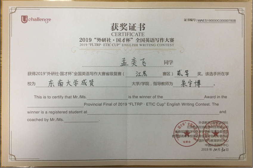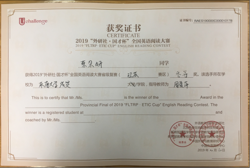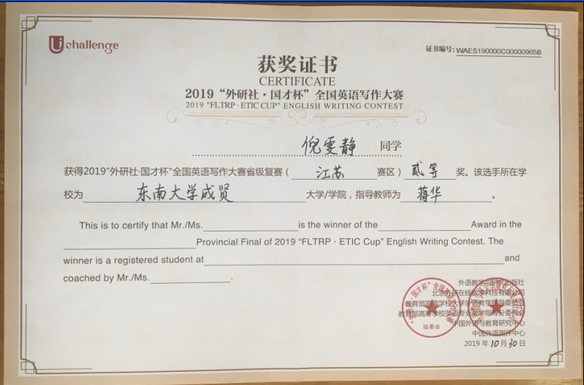 该挑战赛分为英语阅读大赛、英语写作大赛和英语演讲大赛三部分,在江苏赛区英语阅读大赛中,73所本科院校共223名选手参赛,糖心视频 2017级会计1班邓一纯(指导老师:周爱萍)荣获一等奖,在全省名列第十一;2017级建筑工程1班孟奕飞(指导老师:朱宇博)获得二等奖;2018级国贸2班蔡朵妍(指导老师:周爱萍)获得三等奖。