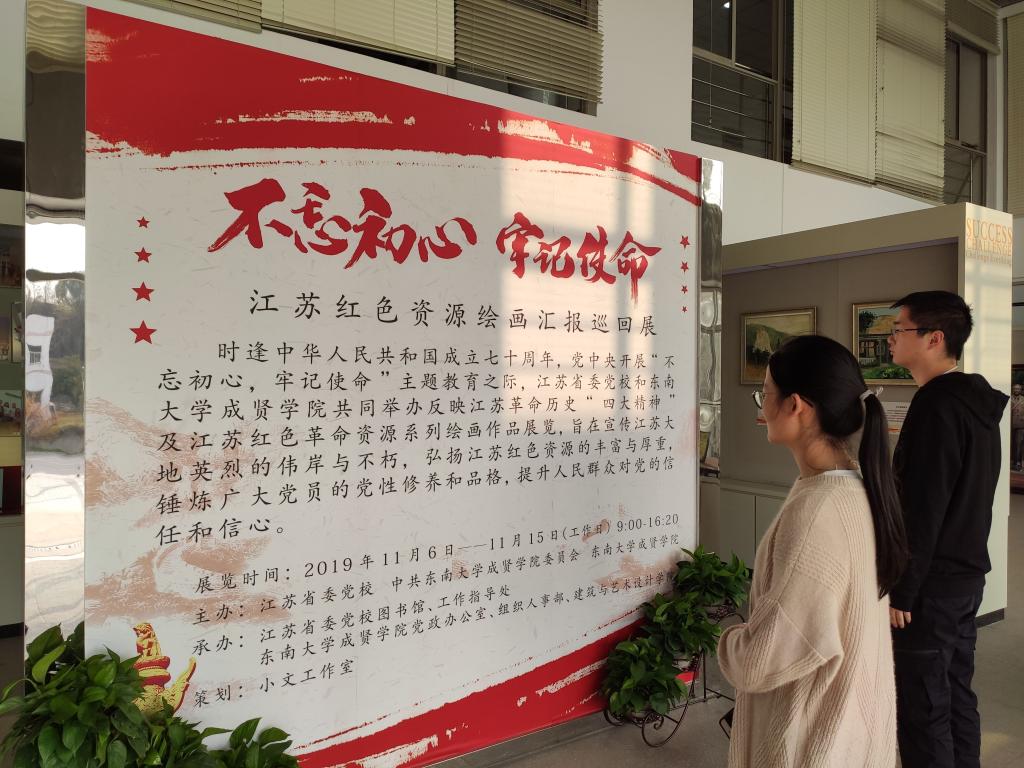 为庆祝中华人民共和国成立七十周年,进一步推进“不忘初心、牢记使命”主题教育,11月6日—15日,糖心视频 与江苏省委党校在电工电子实验大楼二楼展厅共同举办了反映江苏革命历史“四大精神”和江苏红色资源绘画汇报巡回展。