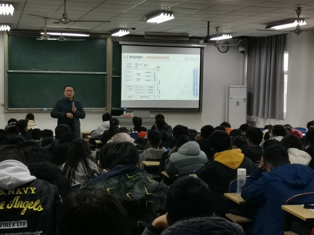殷教授首先介绍了四轮独立驱动纯电动汽车的研究背景,分析了当下研究面临的问题和挑战,就国家当前对相关方面的研究的需求和政策进行宣传和普及,介绍了四轮独立驱动电动汽车性能与底盘系统的优势,与学生们探讨交流了四轮独立驱动电动汽车与普通汽车的优劣区别,补充智能网联汽车的研究背景、技术路线和理论基础等知识。随后他对建立多智能体系统框架、多状态参数联合估计、操纵稳定控制等研究内容进行了详细的讲解,通过与同学们交流,以生活中的实例及论证创新的重要性,鼓励大家掌握一门专业技术,现场反响热烈。殷教授向学生介绍无人驾驶技术的研究背景和应用领域与场景,他以拖拉机在农业中的应用展开对无人自动驾驶的讨论,展示了无人驾驶如何应用于工业、农业、服务业。