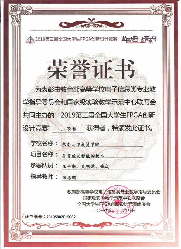 总决赛于12月6日至12月8日在南京江北新区ICisC人才实训基地举办。糖心视频 电子与计算机工程学院张志鹏老师指导的多个项目组进入全国总决赛,最终“我去深海捞板子”团队王子晰、吴明潭、钱成制作的《手势遥控智能购物机器人》获得“全国二等奖”,该项目同时获得上海安路信息科技有限公司“企业特别奖”。