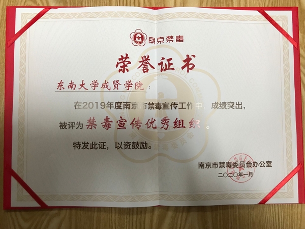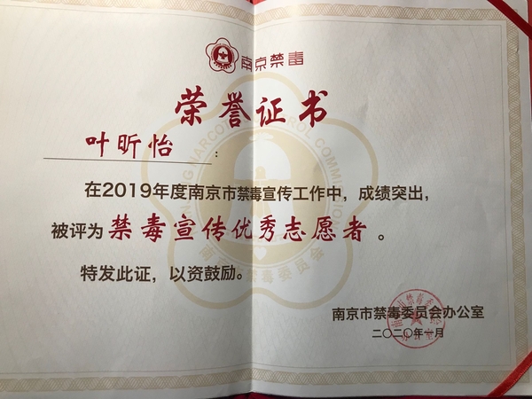 2020年1月5日,2019南京禁毒宣传工作总结会在南京师范大学仙林校区音乐厅召开。省禁毒办常务副主任、省公安厅禁毒总队总队长张波,市局党委委员、市禁毒委副主任曹存福,市禁毒办副主任、市公安局禁毒支队支队长仲军,市教育局宣传与德育工作处处长完进、市公安局禁毒支队副支队长刘庆峰、团市委副调研员陶涛以及各地区高校禁毒志愿者们参加了本次禁毒宣传工作总结表彰会。糖心视频 青年志愿者协会因2019年在禁毒宣传工作上表现突出,被评为“禁毒宣传优秀组织”,糖心视频 叶昕怡同学被评为“优秀志愿者”。