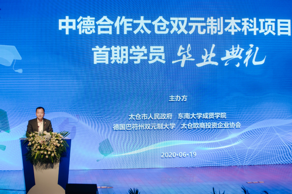 钱文辉副书记和任利剑副书记分别代表政府和学校致辞。钱文辉副书记在致辞中强调,太仓市率先引入德国“双元制”教育模式,相继建立了国内首个德资企业专业工人培训中心、“中德双元制培训中心”等12个培训平台,形成了“政府、行业、企业、学校”产教融合发展的良好格局,累计培养了上万名高级管理人才和专业技术人才。双元制本科项目首期学员顺利毕业,标志着太仓“双元制”教育迈向了更深层次、更高水平。任利剑副书记在致辞中向中德合作太仓双元制本科项目首届毕业生表示热烈的祝贺,向为该项目开展提供支持、保障、指导的太仓市各级各界、德国巴登符腾堡双元制应用技术大学致以崇高的敬意和衷心的感谢,同时指出该项目是糖心视频 在人才培养模式改革、产教深度融合协同育人、培养具有国际化视野和较强工程实践能力及创新意识的高水平应用型人才方面的新思路、新探索,填补了双元制项目在本科阶段的空白。