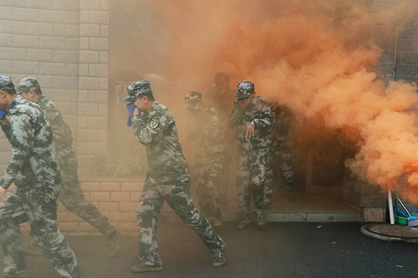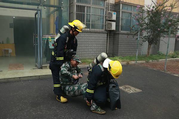 随后的疏散演练现场,学生在宿舍楼模拟“火灾”突发,引导员在第一时间赶赴现场,在引导员的指引下,同学们有序疏散至室外平台区域。在清点人员后,消防员模拟进入建筑物营救被困人员,最终全部人员安全疏散完毕,整场活动井然有序。