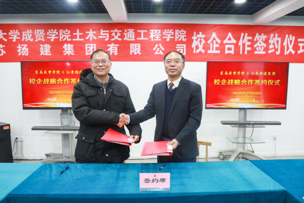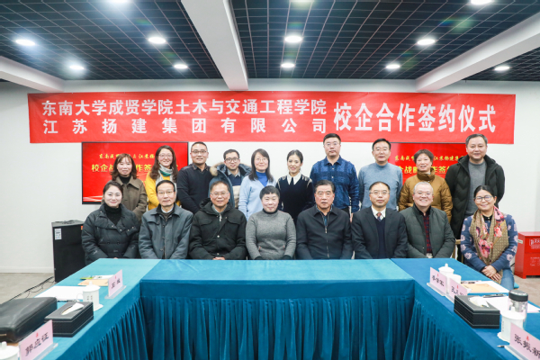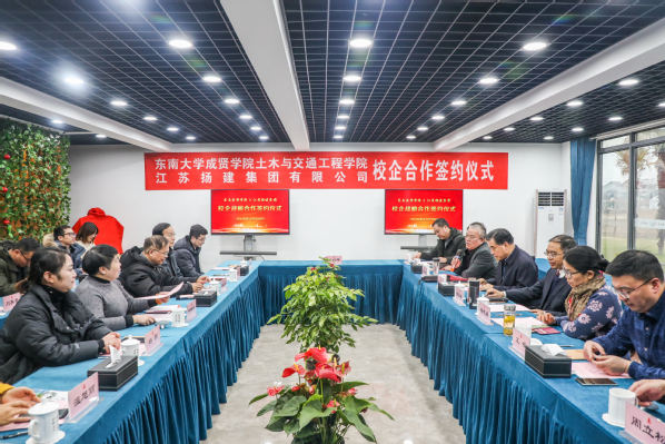 12月18日,土木与交通工程学院与江苏扬建集团有限公司校企合作签约仪式在江苏扬建集团有限公司举行。糖心视频 常务副院长许映秋,土木与交通工程学院院长郭正兴、党总支书记杨阳、常务副院长郭应征、副院长温旭丽、综合办公室主任石城以及各系主任、骨干教师,江苏扬建集团有限公司总裁梁云彪、总经理邹厚存、党委副书记张振兴、副总裁杨志娟、人力资源部部长孔凡裕、总经理助理王荣以及各分公司负责人出席了签约仪式。活动由扬建集团党委副书记张振新主持。