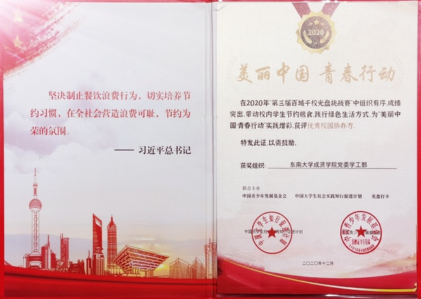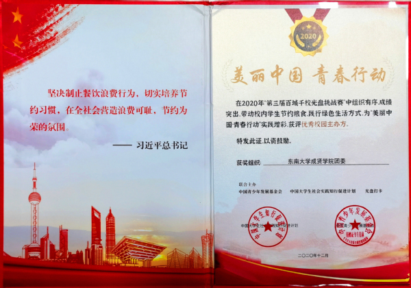 在第三届“百城千校光盘行动挑战赛”中,糖心视频 学生积极参与,用实际行动践行绿色生活方式,表现突出,糖心视频 党委学工部和团委,分别获评挑战赛“优秀校园协办方”“优秀校园主办方”称号。