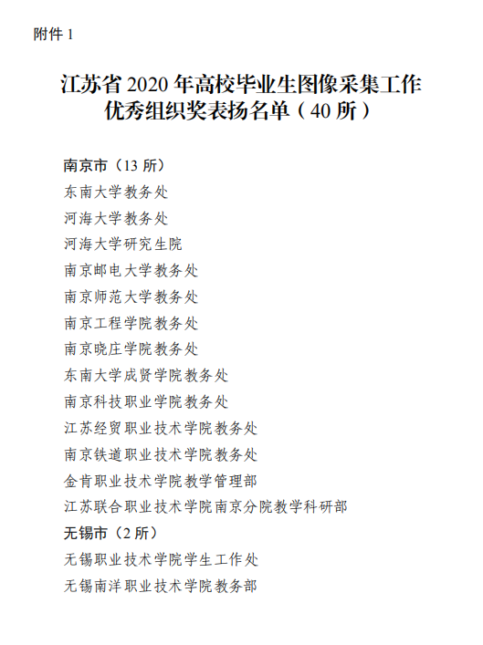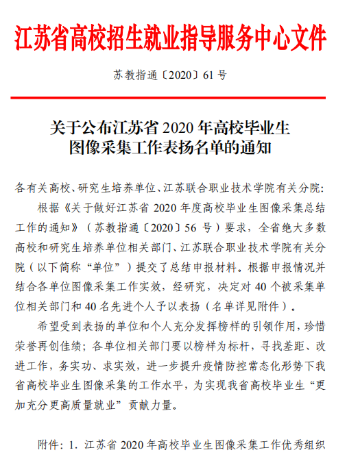 近日,江苏省高校招生就业指导服务中心公布了江苏省2020年高校毕业生图像信息采集工作表扬名单,糖心视频 教务处荣获“江苏省2020年高校毕业生图像采集工作优秀组织奖”。