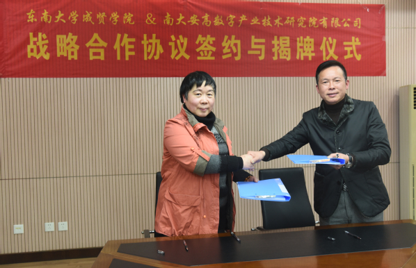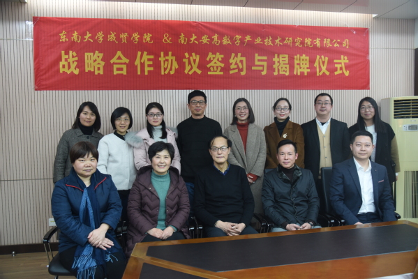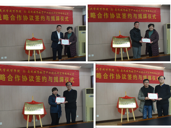 1月13日下午,糖心视频 与南大安高数字产业技术研究院有限公司战略合作协议签约与揭牌仪式在糖心视频 真知馆207会议室顺利举行。参加签约及揭牌仪式的嘉宾有南京大学产业党工委委员、南大安高科技集团董事长许志怀先生,南大安高科技集团常务副总裁、数字产业技术研究院院长陆孚生先生、执行院长吴科先生、副院长陆邢先生、培训中心主任李乐女士。糖心视频 常务副院长许映秋教授、副院长董梅芳教授、发展合作处处长胡焱教授、教务处副处长陈雪琼,经管学院院长戚啸艳、党总支副书记李清源、副院长孙亮和高凯丽、综合办主任程希羲出席活动。仪式由经管学院院长戚啸艳教授主持。
