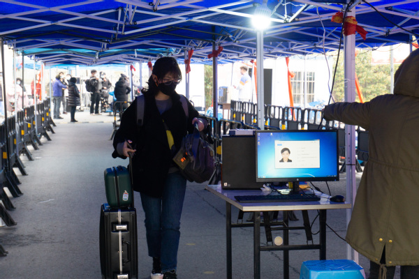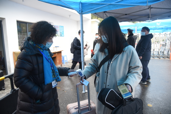 返校当天,学生们佩戴口罩,配合工作人员有序查验健康码、核对身份信息、检测体温,核对与检测无误后进入校园。