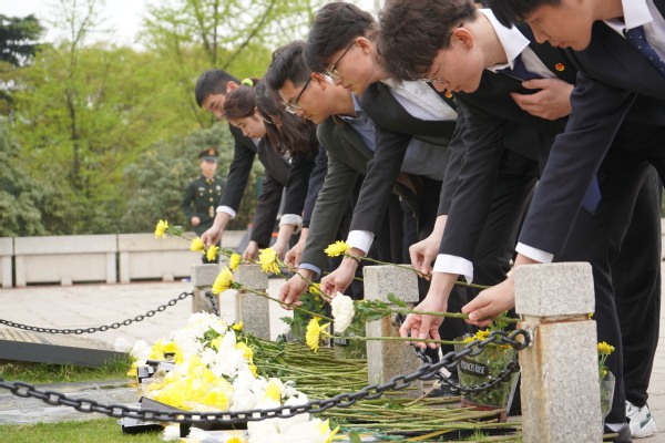 本次主题教育活动主要包括祭扫仪式及党史知识学习两个环节。祭扫仪式伊始,近百名师生胸佩白花、手捧鲜菊、装容肃穆,怀着对革命烈士的崇高敬意和绵绵哀思,认真聆听、回顾了雨花台烈士陵园的历史和革命烈士的英雄事迹。随后,学生代表还一同朗诵了诗歌《先烈》,用朴素的方式寄托最深切的悼念。接着,全场默哀并宣誓,缅怀雨花英烈,铭记光辉历史。仪式最后,现场师生手持菊花,依次走到纪念碑前献上并行鞠躬礼,以示哀悼祭扫仪式结束,师生代表有序进入雨花台纪念馆,认真学习了纪念馆里的党史知识,回忆峥嵘岁月里的传奇故事,引导团员青年继承和发扬光荣传统,坚定中国特色社会主义理想信念。