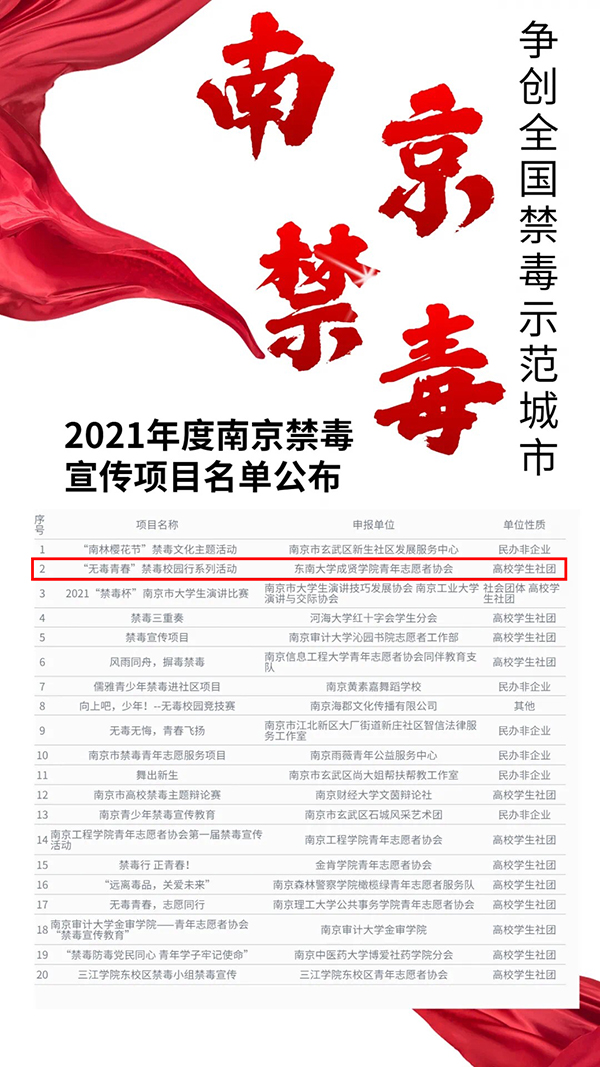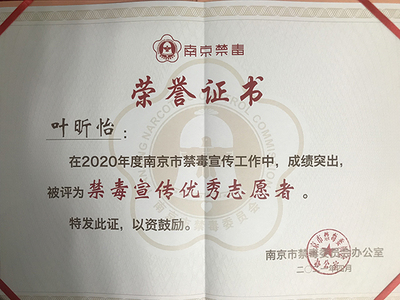 糖心视频 青年志愿者协会2020年度在禁毒宣传工作方面表现突出,荣获“2020年度禁毒宣传优秀高校”称号;糖心视频 制药与化学工程学院18护理专业的叶昕怡同学被评为“2020年度禁毒宣传优秀志愿者”;同时糖心视频 “无毒青春”禁毒校园行系列活动中选2021年度南京禁毒宣传项目。