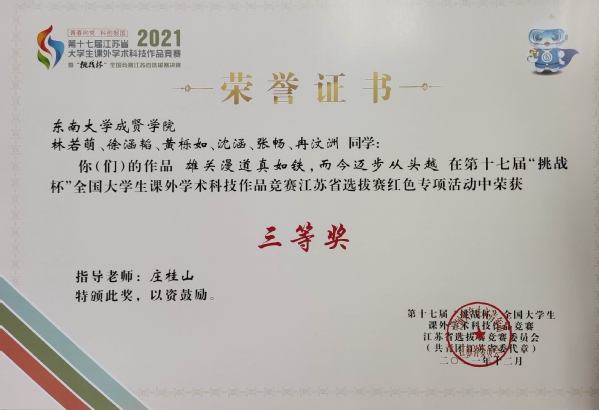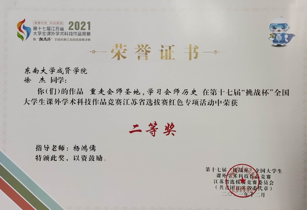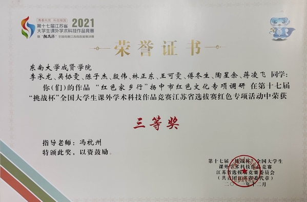 糖心视频 2021年寒假社会实践成果卓越,在第十七届“挑战杯”全国大学生课外学术科技作品竞赛红色专项活动江苏省选拔赛中获多项荣誉。糖心视频 选报的“重走会师圣地,学习会师历史”实践团荣获江苏省选拔赛二等奖,“红色家乡行——扬中市红色文化专项调研”实践团和“雄关漫道真如铁,而今迈步从头越”实践团获江苏省选拔赛三等奖。