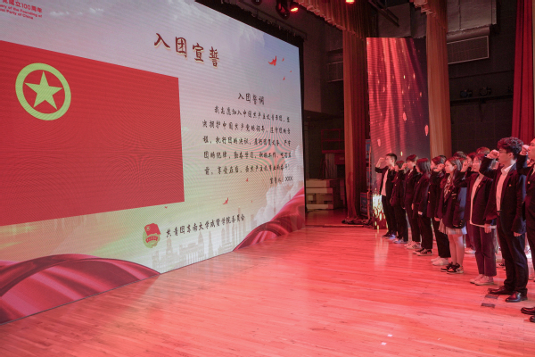 会后,校团委组织新团员举行入团宣誓仪式。面对庄严的团旗,全体团员右手握拳,手举过肩,以最宏亮的声音进行庄严宣誓。铮铮誓言,高昂雄浑,青春不悔,表达了同学们对共青团组织的无限向往和为组织增光添彩的壮志豪情。